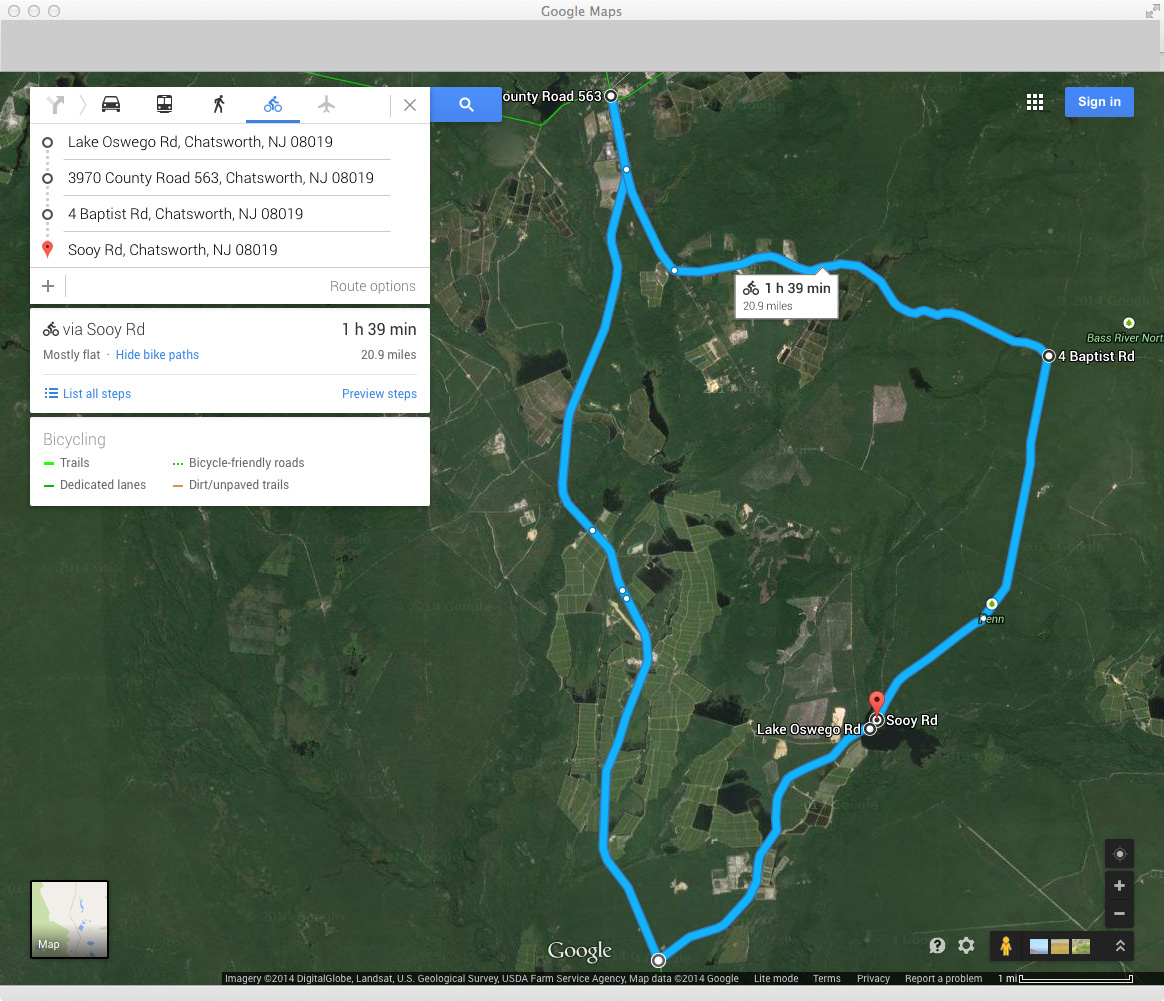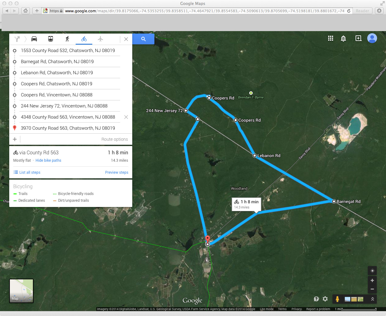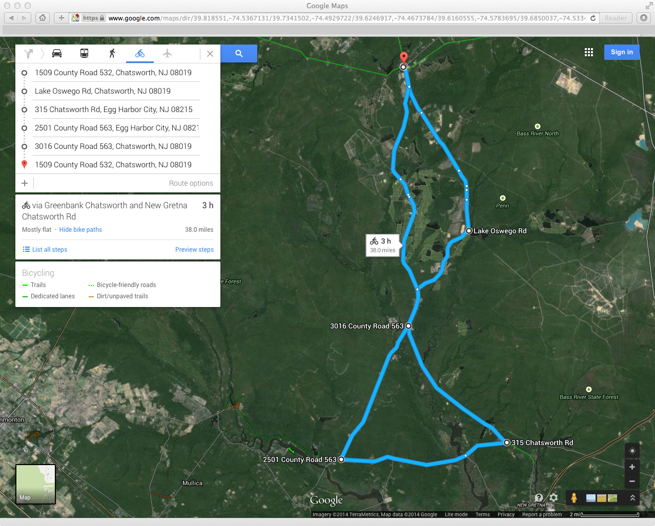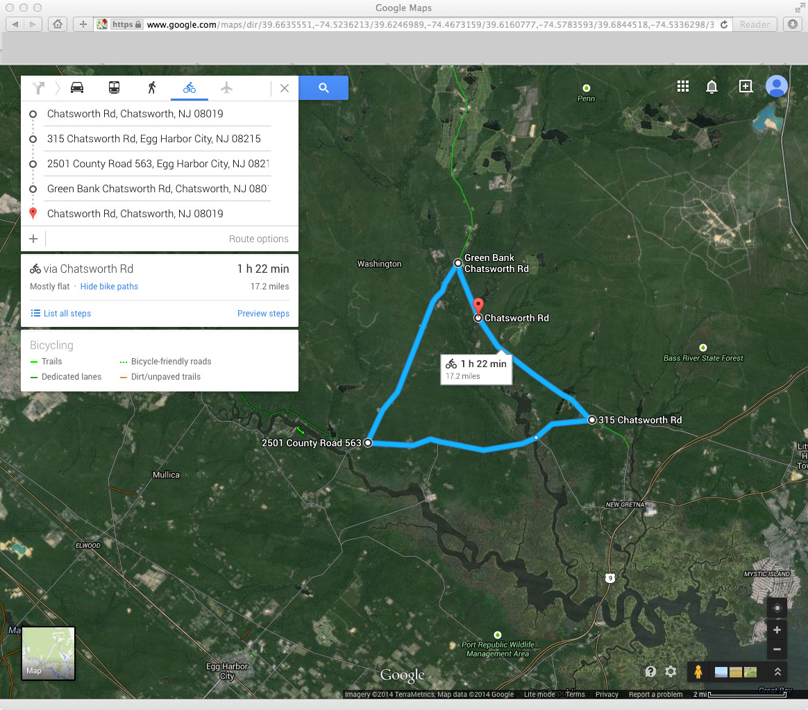 A note about the NJ Pinelands Trails: I strongly recommend carrying adequate food, water and mechanical supplies on these trips. Limited food service is seasonably available at a hotdog stand in Chatsworth, NJ and nearest bicycle mechanical support (not a trike shop) is over 20 miles away in Medford, NJ. Do not leave your parked motor vehicle unsecured and keep all valuable items out of sight.