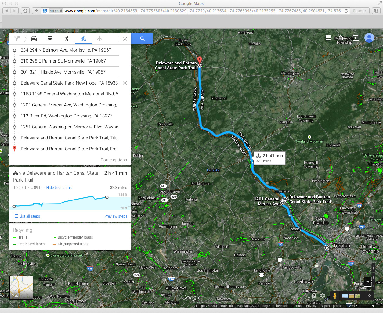 A note about the Delaware River Canal Trails: These routes pass through several small towns that all offer food and water sales. There are also three locations for bicycle repair very near the trails. These shops are located in Frenchtown, NJ, Yardley, PA, and Morrisville, PA. The nearest trike shop is Jersey Bents, about 15 miles from Yardley, PA.